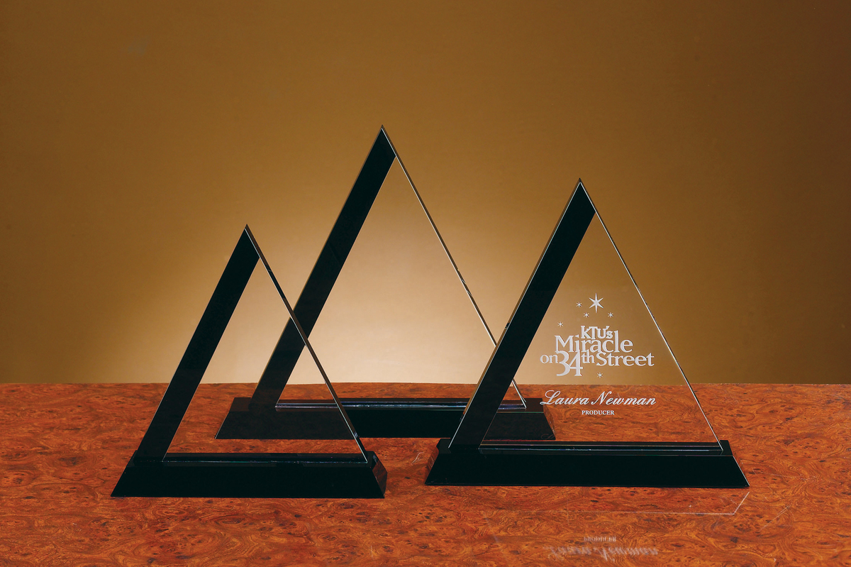 This sleek award features a bold triangular design with a pointed top, elegantly mounted on a sturdy rectangular base. Weighing 3.8 lbs., it offers a refined and modern presentation, perfect for honoring achievement and recognition. A timeless symbol of excellence, this award embodies success and prestige.