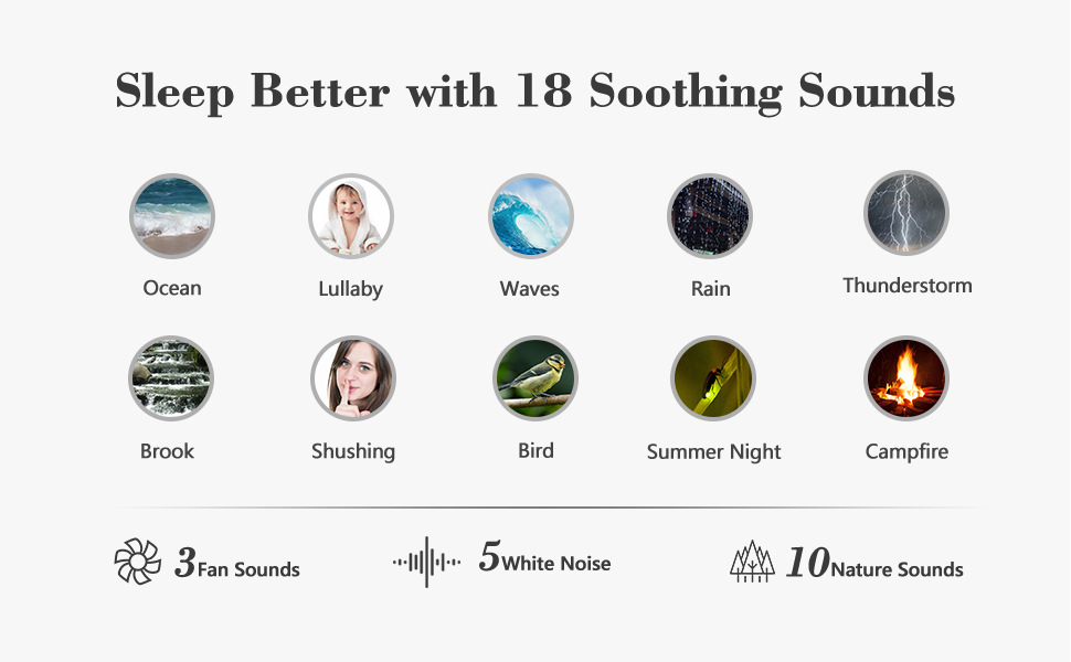 Designed with sound machine and alarm clock in one integrated machine. Helps block disruptive environmental noises in high quality 5W drivers and precise 30-level volume control, so you can fall asleep with ease. 5 white noise, 3 fan sounds and 10 nature sounds including ocean, lullaby, waves, rain, thunderstorm, brook, shush, bird chirping, summer night, campfire.