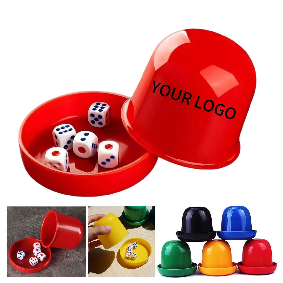 The Plastic Dice Cups with Lid, made of ABS plastic, measure 2.56 x 2.95 x 3.54 inches. It holds standard dice for games like craps or Farkle, with a secure lid for portability. Supports full color, silkscreen, or UV imprinting with a 2 x 2-inch imprint area. Packed in poly bags with samples available. Contact us for more details or to place an order.